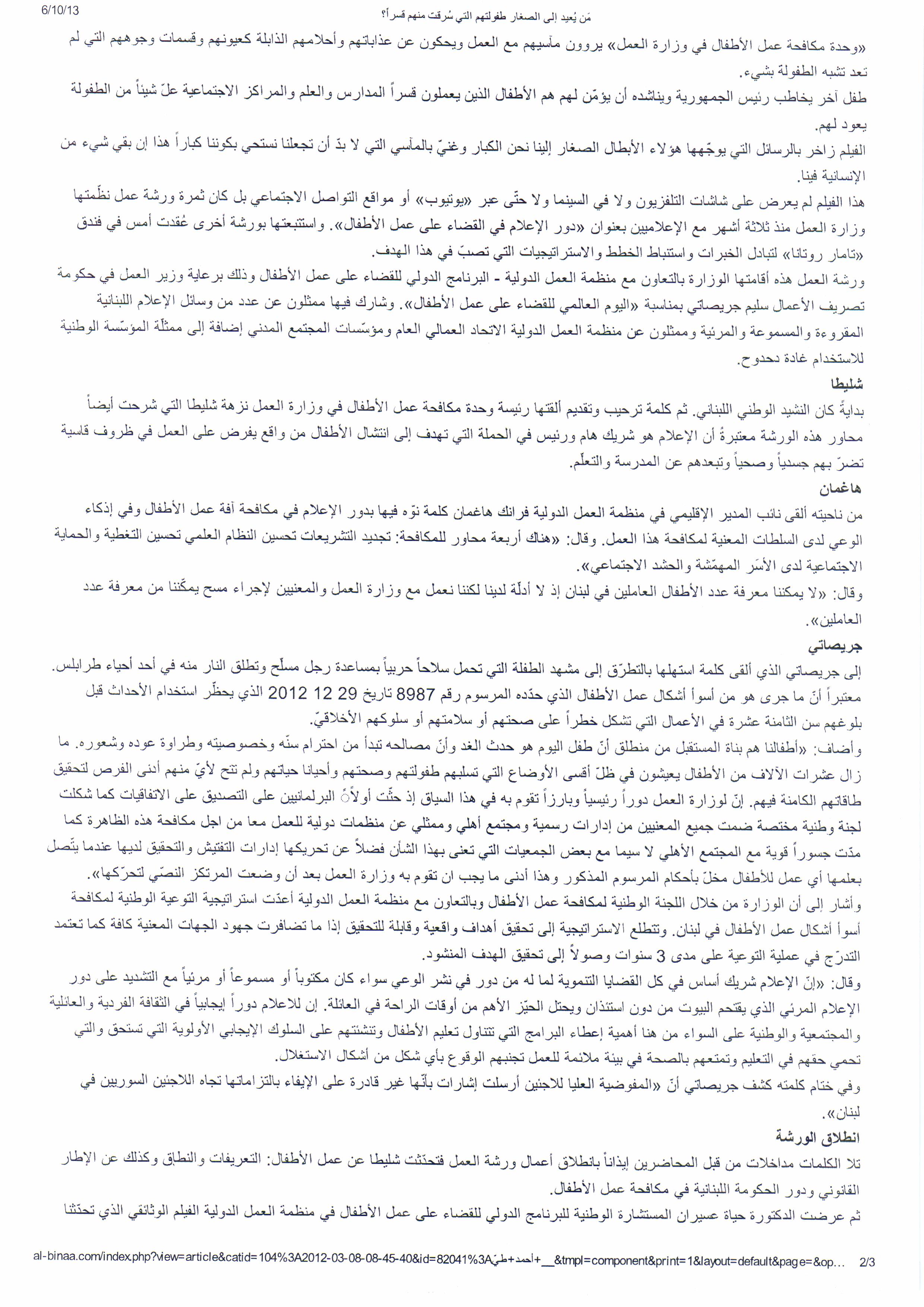 جريصاتي يرعى ورشة عمل الثانية مع الإعلاميين بهدف القضاء على الأطفال الأطفال